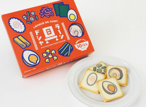 ホワイトチョコをサンドしたラングドシャにラーメンの"具"をプリント。絵柄はランダムなので、どの具が出るかお楽しみに!(10枚入)