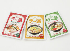 醤油・味噌・とんこつラーメンのスープの色や香りを再現した入浴料です。 ラーメンの麺になったような気分になれるかも?