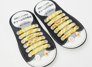 ラーメンの麺がプリントされた靴紐と、なると・玉子の靴紐チャームがセットに。他にはない、個性的なデザインです。[長さ:120cm、140cm]