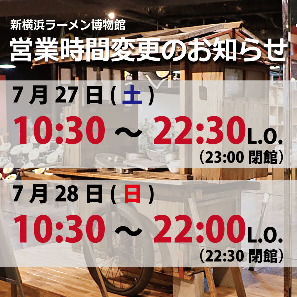 いつも新横浜ラーメン博物館をご利用いただきありがとうございます。2024年7月27日(土)、28日(日)の営業時間を下記の通り変更させていただきます。 2024年7月27日(土)10:30~22:3...