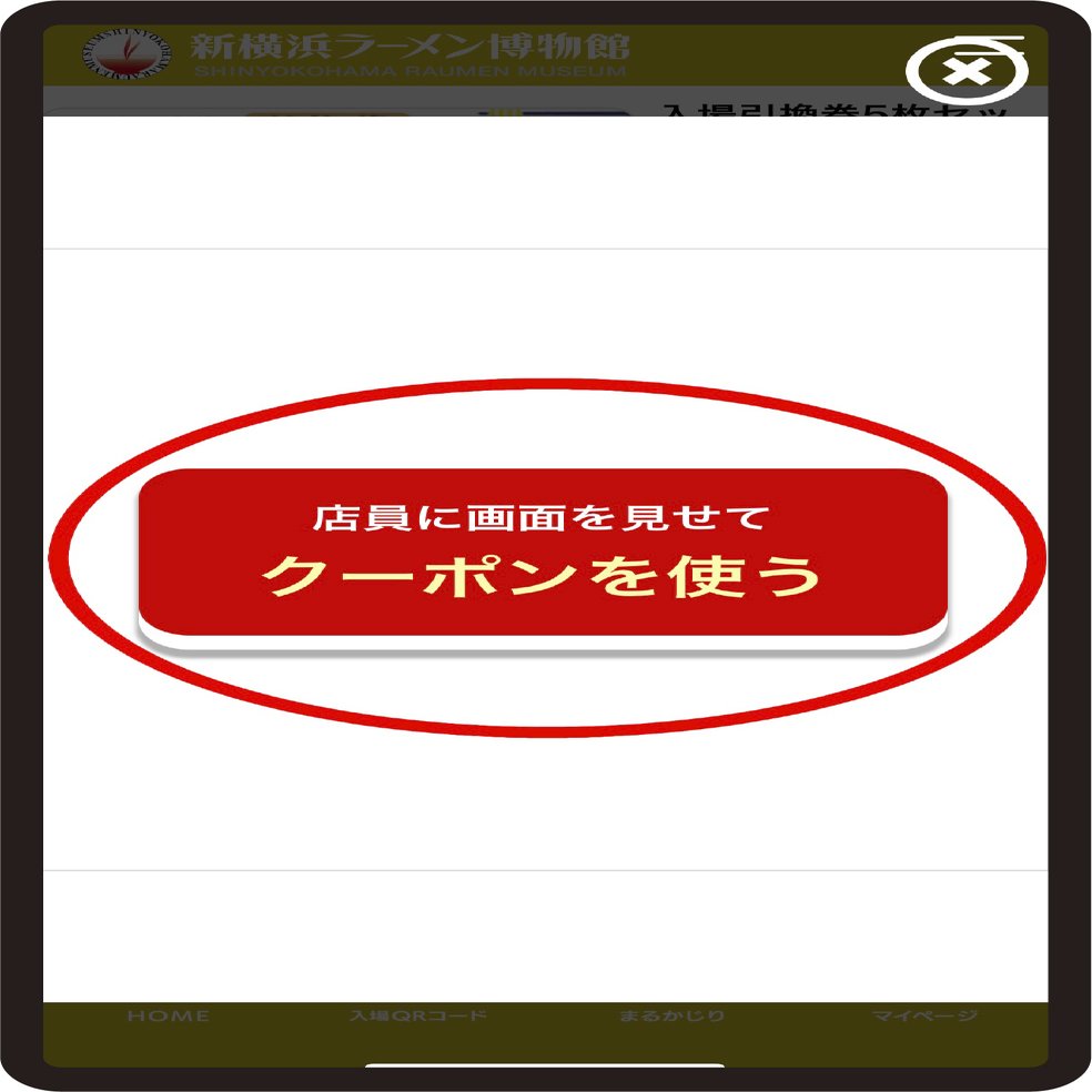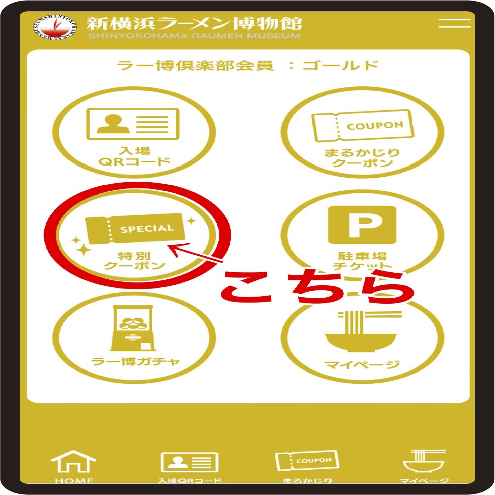 1、ご入館後、1階引き換えカウンターにて、ラー博倶楽部会員アプリ内の「特別クーポン」をタップ