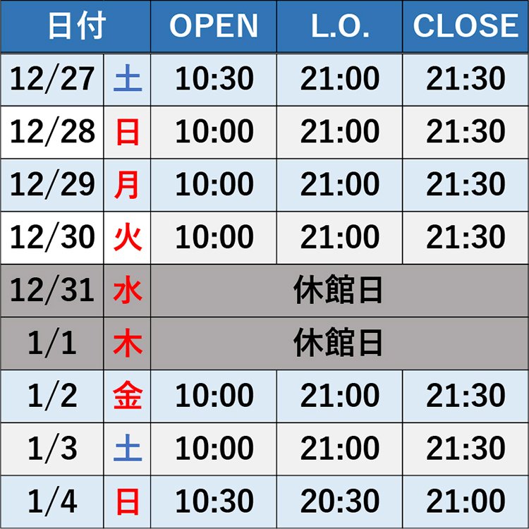 本年も12月31日と1月1日の2日間を休館日とさせていただきます。