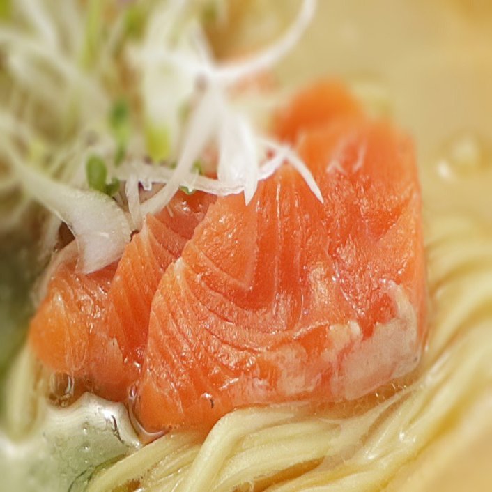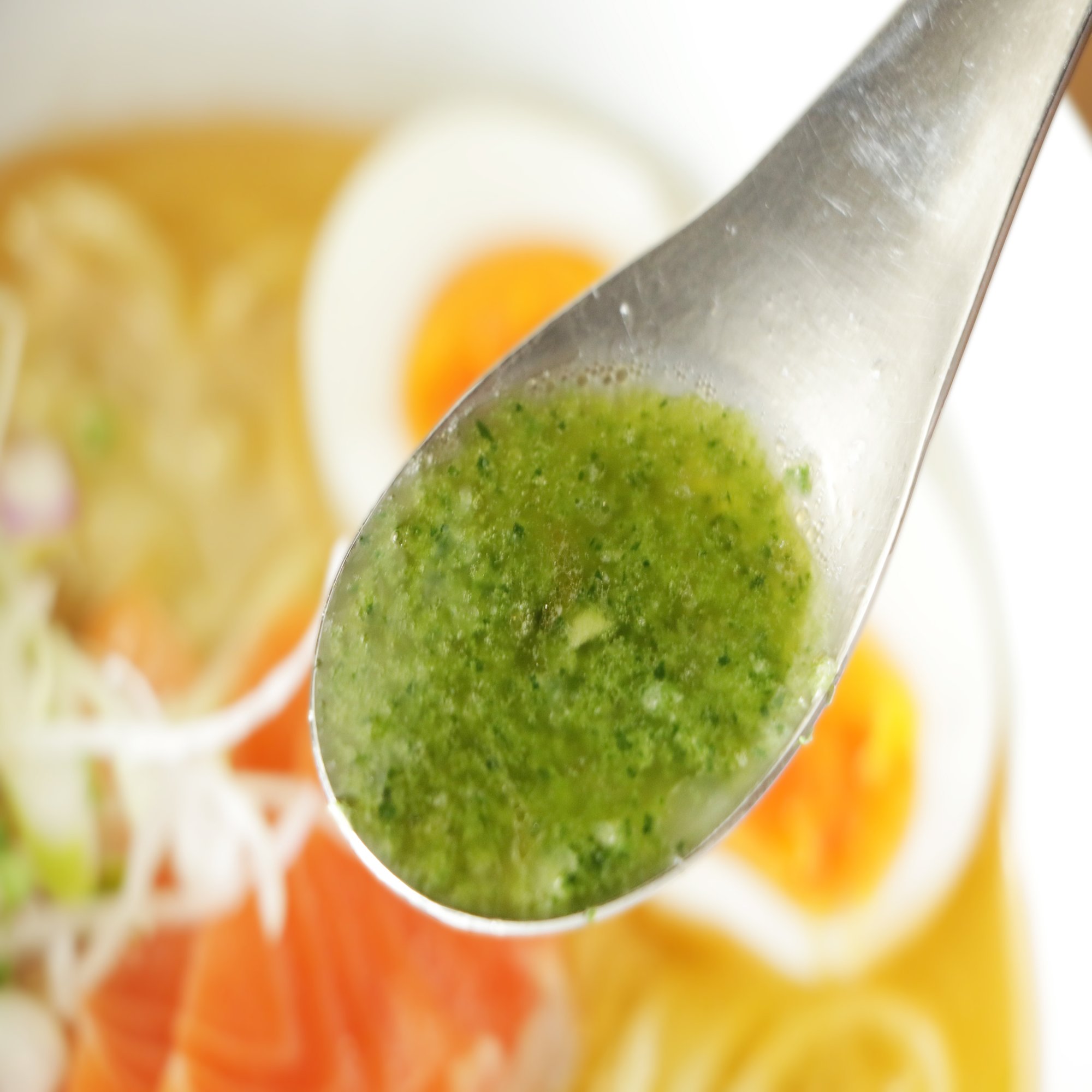 具材は、鱒を低温調理したミキュイ。沖縄海塩、ドイツのスパイス、Exオリーブ油、ローズマリーやタイムなどの香草を纏わせ、単体でも成立する完成度に仕上げられています。だしに寄り添うだけの具ではなく、噛んだときの旨味と香りが、スープの余韻を引き延ばすように設計された"もうひとつの核"。鱒のだし、クレソンオイルとの相性は、言葉より体感の方が早いはずです。