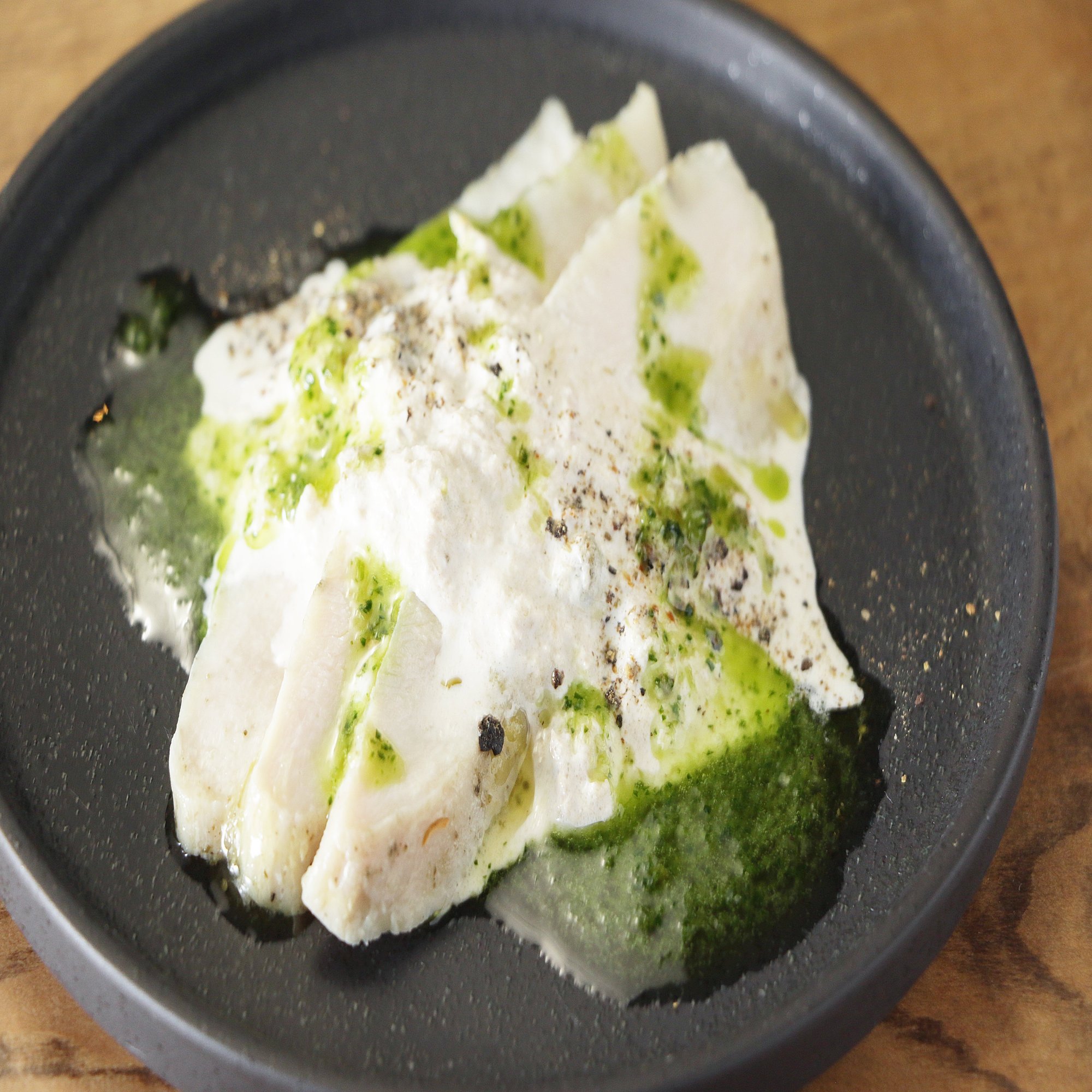 ピエモンテ州の伝統料理「ヴィテッロ・トンナート」から着想し、甲州地どりの胸肉をしっとり柔らかく。トンナートソース(ツナソース)とクレソンオイルを合わせ、山梨の食材と無垢の文脈を一皿に束ねます。