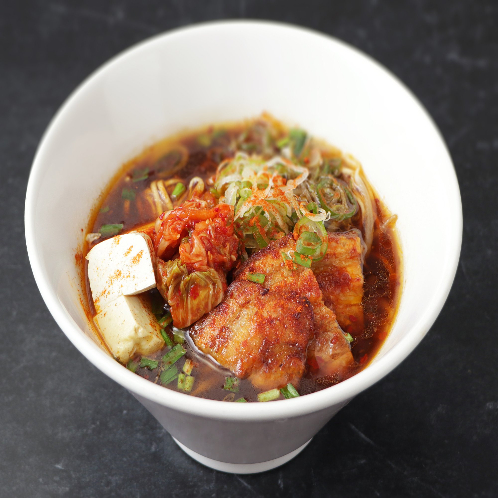 キムチで漬け込んだ豚バラ肉をオーブンでじっくりローストし、香ばしさと凝縮した旨味を引き出しました。そこに豆腐(ズンドゥブの語源)とキチムが加わり、味のグルーヴを完成させます。