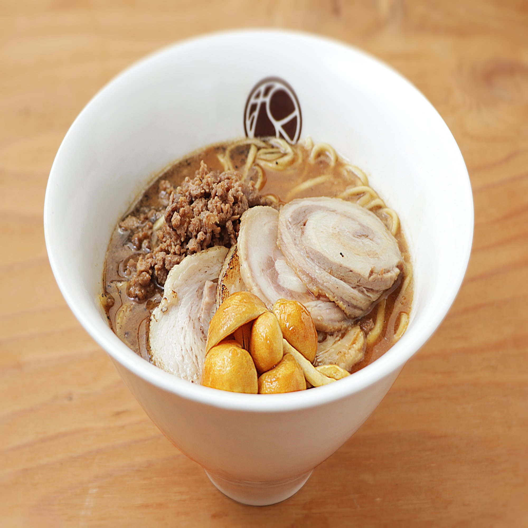 麺は中太のやや平打ち。ほうとうの記憶をほのかに感じさせながらも、ラーメンとしての品格を保つ設計です。その表現のため、支那そばやに製麺を依頼しました。創業者の山本真一さんにとって「支那そばや」の佐野実さんは、長年憧れ続けてきた職人の一人でした。生前に言葉を交わす機会にも恵まれ、その姿勢や考え方は、いまも無垢の根幹に息づいています。