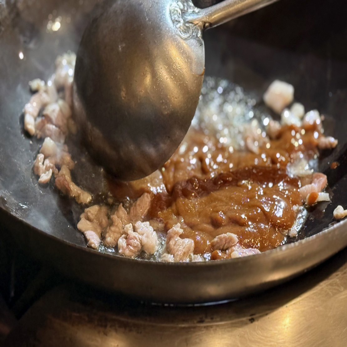 仕上げでは、挽き肉を中華鍋で炒め、脂を引き出し、味噌を焼きます。