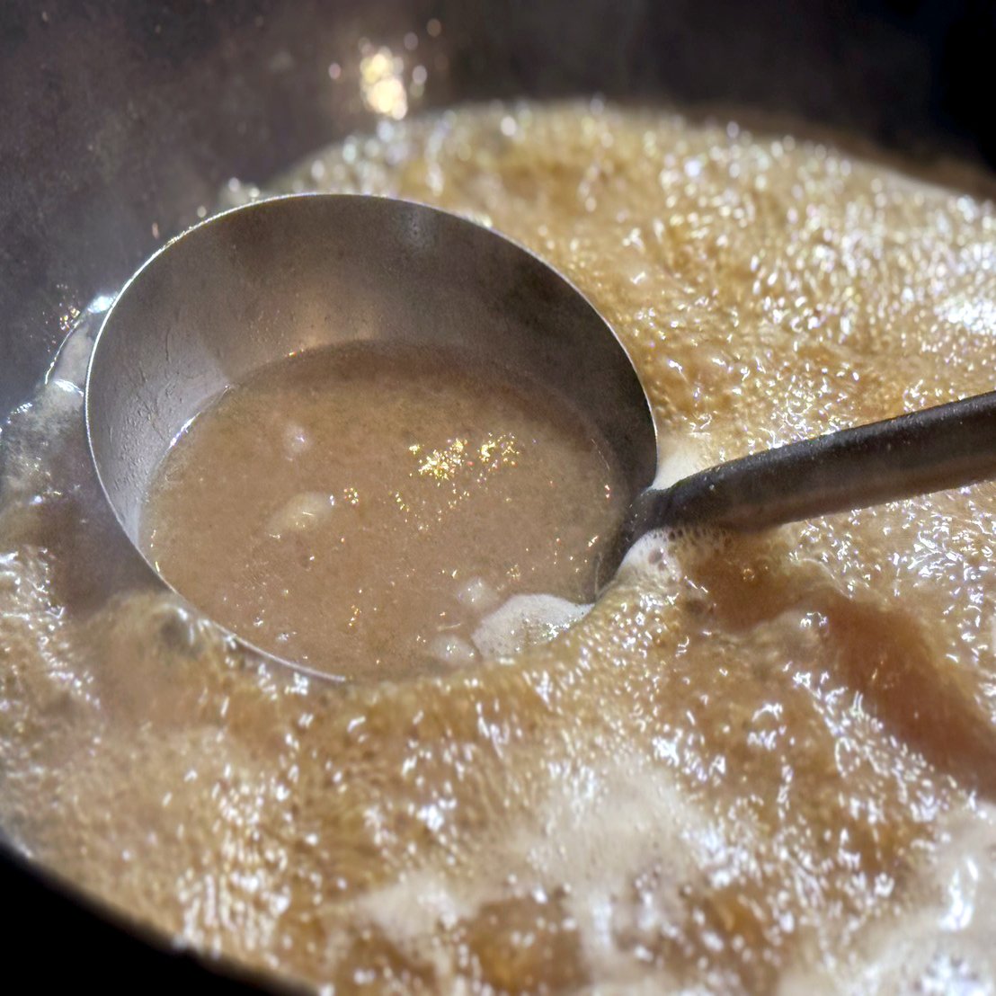 そこに「いのぶた」のガラを重ね、イノシシと豚のバラ肉を加え、肉の旨味そのものを溶け込ませながら、野性の輪郭を保つ火加減で炊き上げます。
